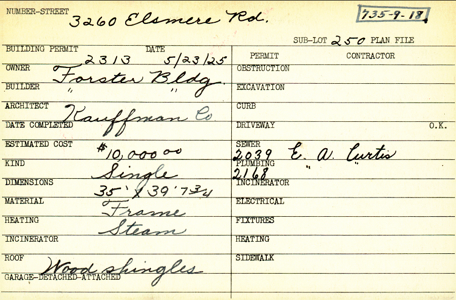 3260 Elsmere Road Shaker Heights, OH 44120 PARCEL ID: 735-09-018 Building Permit Date: 05-23-1925 Plan File Number: 0 Neighborhood: Fernway Owner: Forster Building Builder: Forster Building Architect: Kauffman Company Estimated Cost: 10000 Kind: Single, Single Residence or Dwelling Material: Frame Heating: Steam Roof: Wood Shingle Card Available: yes |