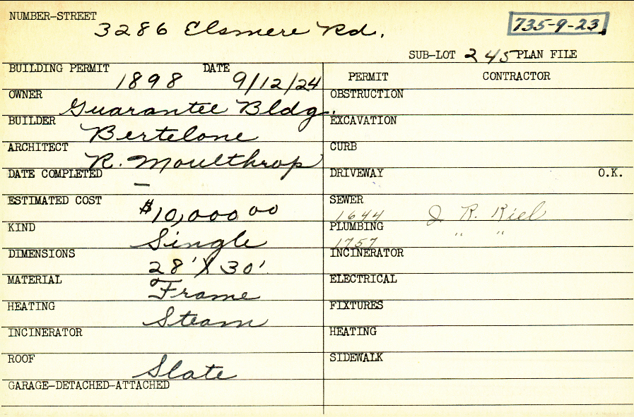 3286 Elsmere Road Shaker Heights, OH 44120 PARCEL ID: 735-09-023 Building Permit Date: 09-12-1924 Plan File Number: 0 Neighborhood: Fernway Owner: Guarantee Building Builder: Bertelone Architect: Moulthrop, R. Estimated Cost: 10000 Kind: Single, Single Residence or Dwelling Material: Frame Heating: Steam Roof: Slate Card Available: yes |