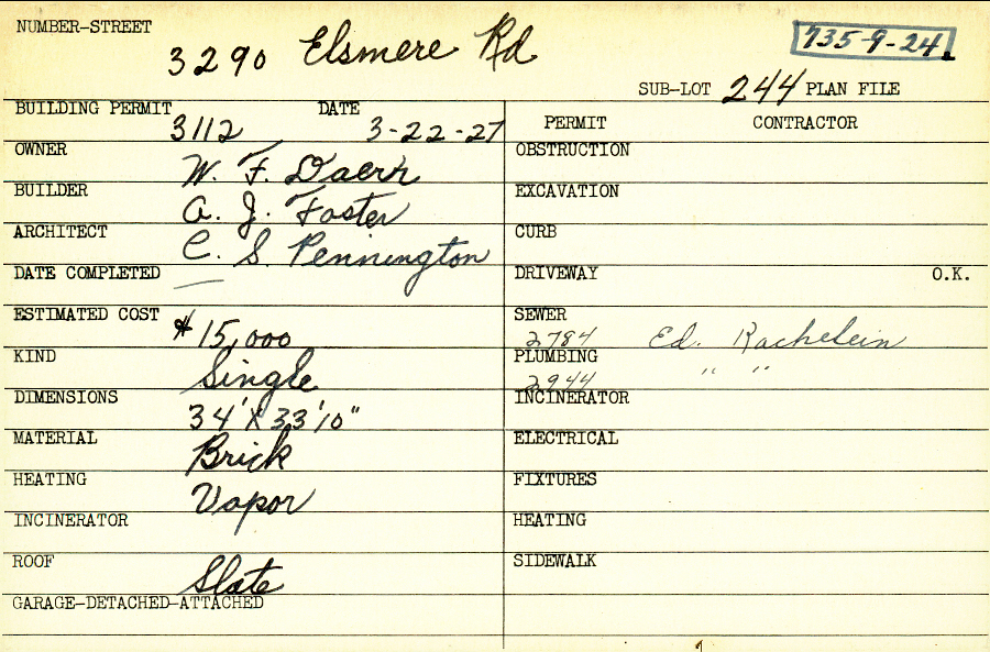 3290 Elsmere Road Shaker Heights, OH 44120 PARCEL ID: 735-09-024 Building Permit Date: 03-22-1927 Plan File Number: 0 Neighborhood: Fernway Owner: Daerr, W. F. Builder: Foster, A. J. Architect: Pennington, C. S. Estimated Cost: 15000 Kind: Single, Single Residence or Dwelling Material: Brick Heating: Vapor Roof: Slate Card Available: yes |