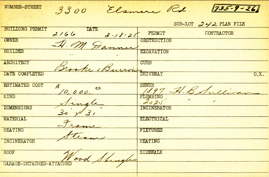 3300 Elsmere Road Shaker Heights, OH 44120 PARCEL ID: 735-09-026 Building Permit Date: 03-18-1925 Plan File Number: 0 Neighborhood: Fernway Owner: Danner, H. M. Builder: Danner, H. M. Architect: Brooke and Burrows Estimated Cost: 10000 Kind: Single, Single Residence or Dwelling Material: Frame Heating: Steam Roof: Wood Shingle Card Available: yes |