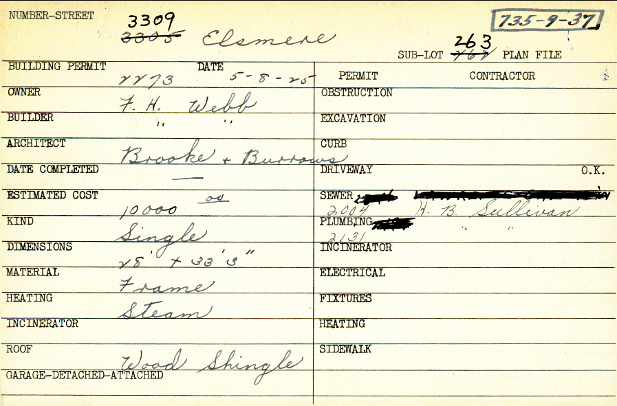 3309 Elsmere Road Shaker Heights, OH 44120 PARCEL ID: 735-09-037 Building Permit Date: 05-08-1925 Plan File Number: 0 Neighborhood: Fernway Owner: Webb, F. H. Builder: Webb, F. H. Architect: Brooke and Burrows Estimated Cost: 10000 Kind: Single, Single Residence or Dwelling Material: Frame Heating: Steam Roof: Wood Shingle Card Available: yes |
