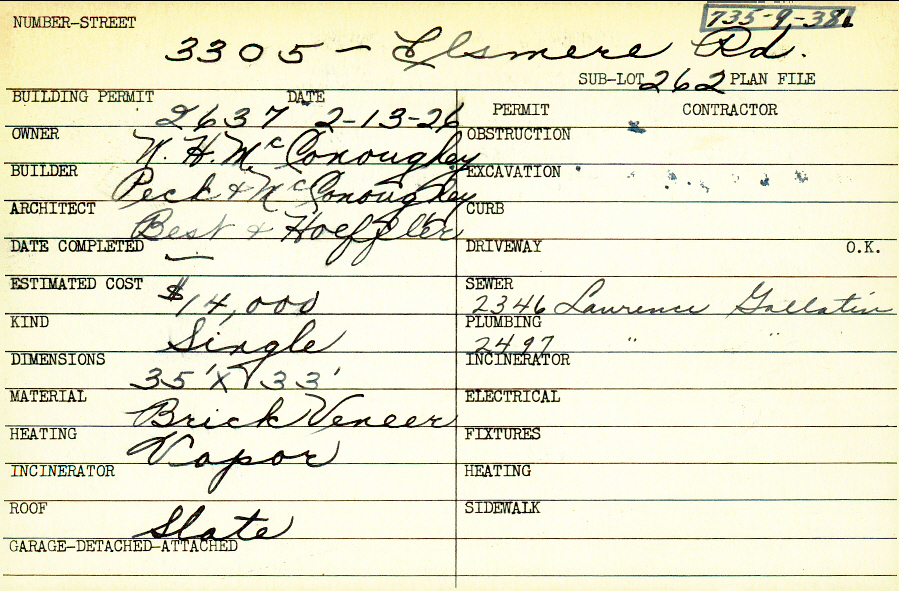 3305 Elsmere Road Shaker Heights, OH 44120 PARCEL ID: 735-09-038 Building Permit Date: 02-13-1926 Plan File Number: 950 all scanned Microfilm Roll: Roll012 Neighborhood: Fernway Owner: McConoughey, W. H. Builder: Peck and McConoughey Architect: Best and Hoefler Estimated Cost: 14000 Kind: Single, Single Residence or Dwelling Material: Brick Veneer Heating: Vapor Roof: Slate |