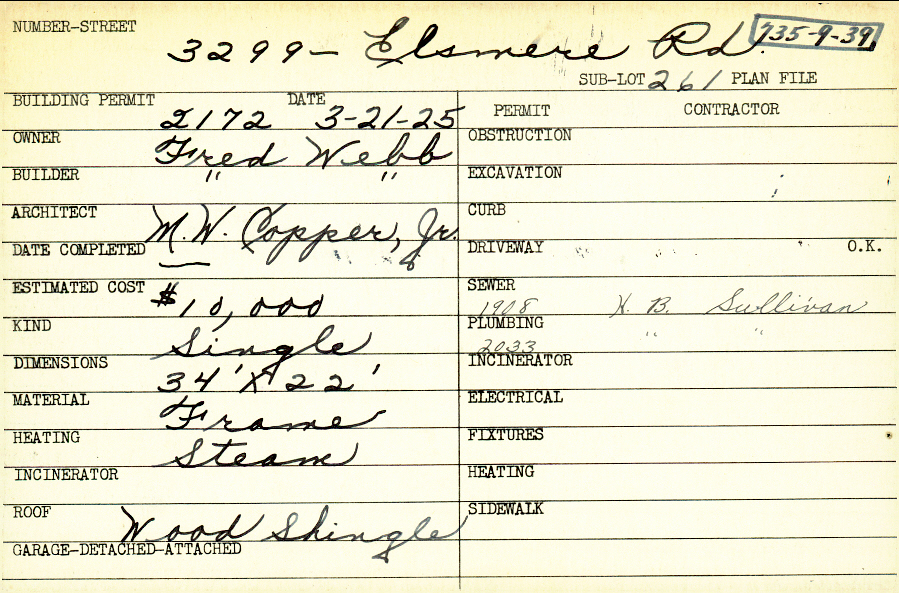 3299 Elsmere Road Shaker Heights, OH 44120 PARCEL ID: 735-09-039 Building Permit Date: 03-21-1925 Plan File Number: 0 Neighborhood: Fernway Owner: Webb, Fred Builder: Webb, Fred Architect: Copper, Munroe Walker Jr. Estimated Cost: 10000 Kind: Single, Single Residence or Dwelling Material: Frame Heating: Steam Roof: Wood Shingle |
