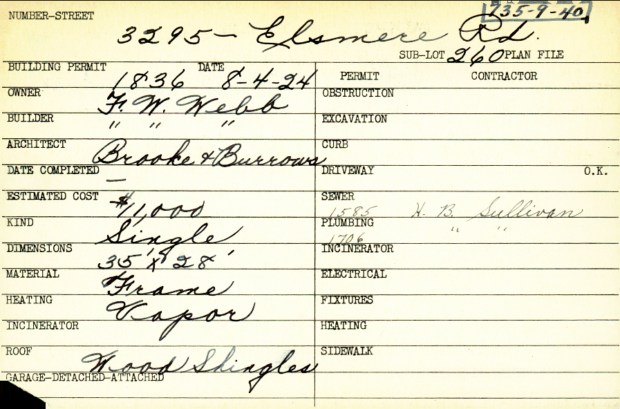 3295 Elsmere Road Shaker Heights, OH 44120 PARCEL ID: 735-09-040 Building Permit Date: 08-04-1924 Plan File Number: 0 Neighborhood: Fernway Owner: Webb, F. W. Builder: Webb, F. W. Architect: Brooke and Burrows Estimated Cost: 11000 Kind: Single, Single Residence or Dwelling Material: Frame Heating: Vapor Roof: Wood Shingle Card Available: yes |