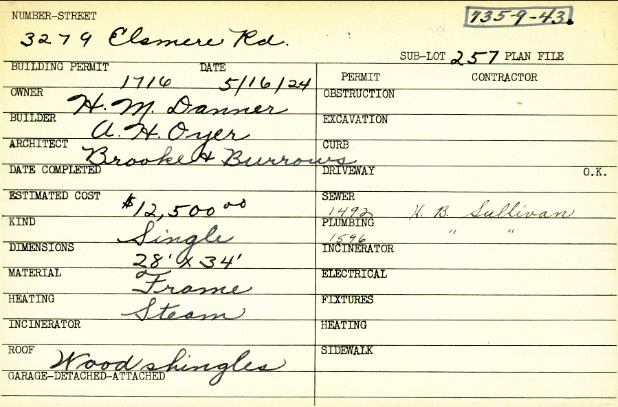 3279 Elsmere Road Shaker Heights, OH 44120 PARCEL ID: 735-09-043 Building Permit Date: 05-16-1924 Plan File Number: 12734 Microfilm Roll: NewRoll#14 Neighborhood: Fernway Owner: Danner, H. M. Builder: Oyer, A. H. Architect: Brooke and Burrows Estimated Cost: 12500 Kind: Single, Single Residence or Dwelling Material: Frame Heating: Steam Roof: Wood Shingle |