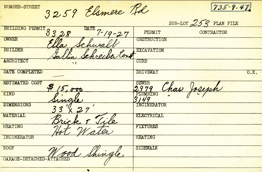 3259 Elsmere Road Shaker Heights, OH 44120 PARCEL ID: 735-09-047 Building Permit Date: 07-19-1927 Plan File Number: 0 Neighborhood: Fernway Owner: Schwalb, Ella Builder: Gallin Schreiber Construction Architect: Gallin Schreiber Construction Estimated Cost: 15000 Kind: Single, Single Residence or Dwelling Material: Brick & Tile Heating: Hot Water Roof: Wood Shingle Card Available: yes |