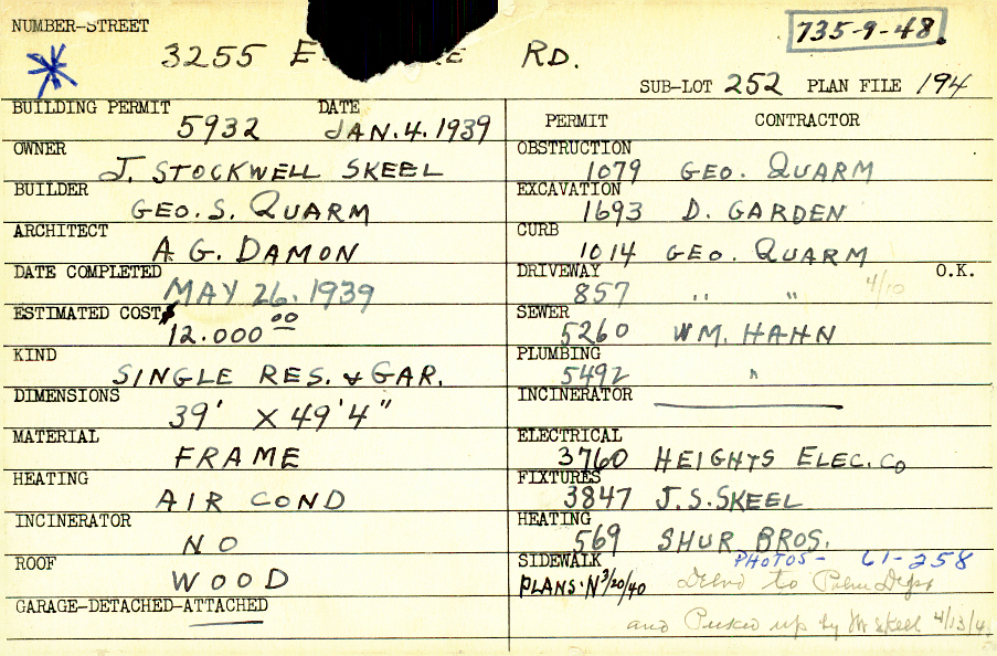 3255 Elsmere Road Shaker Heights, OH 44120 PARCEL ID: 735-09-048 Building Permit Date: 01-04-1939 Plan File Number: 194, 10886 Microfilm Roll: NewRoll#6 Neighborhood: Fernway Owner: Skeel, J. Stockwell Builder: Quarm, George S. Architect: Damon, Austin G. Estimated Cost: 12000 Date Completed: 05-26-1939 Kind: Single Dwelling and Garage Material: Frame Heating: Air Conditioned Roof: Wood Garage: attached |