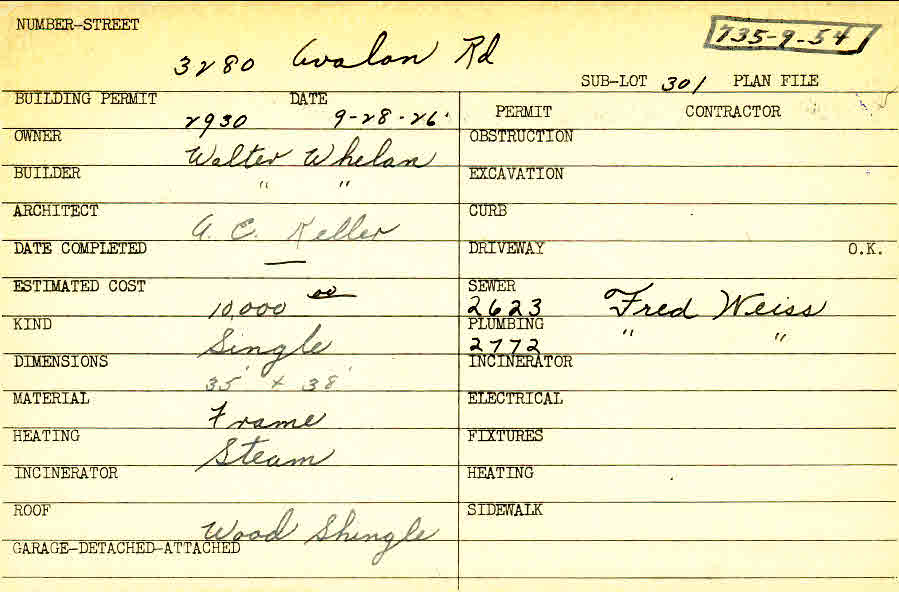 3280 Avalon Road Shaker Heights, OH 44120 PARCEL ID: 735-09-054 Building Permit Date: 09-28-1926 Plan File Number: 0 Neighborhood: Fernway Owner: Whelan, Walter Builder: Whelan, Walter Architect: Keller, Arthur Emil Estimated Cost: 10000 Kind: Single, Single Residence or Dwelling Material: Frame Heating: Steam Roof: Wood Shingle  |