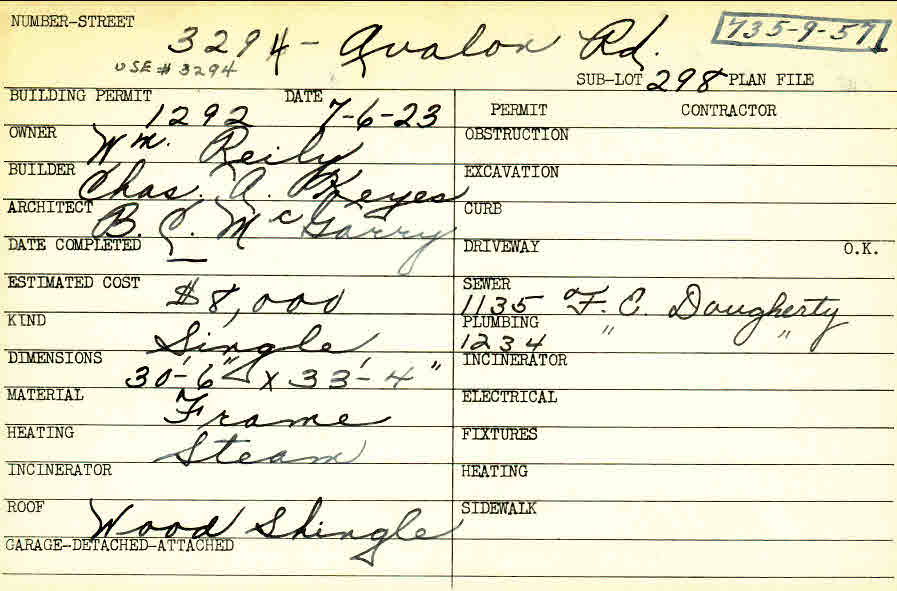 3294 Avalon Road Shaker Heights, OH 44120 PARCEL ID: 735-09-057 Building Permit Date: 07-06-1923 Plan File Number: 4581 Microfilm Roll: Roll#64 Neighborhood: Fernway Owner: Reily, William Builder: Keyes, Charles A. Architect: McGarry, B. C. Estimated Cost: 8000 Kind: Single, Single Residence or Dwelling Material: Frame Heating: Steam Roof: Wood Shingle  |