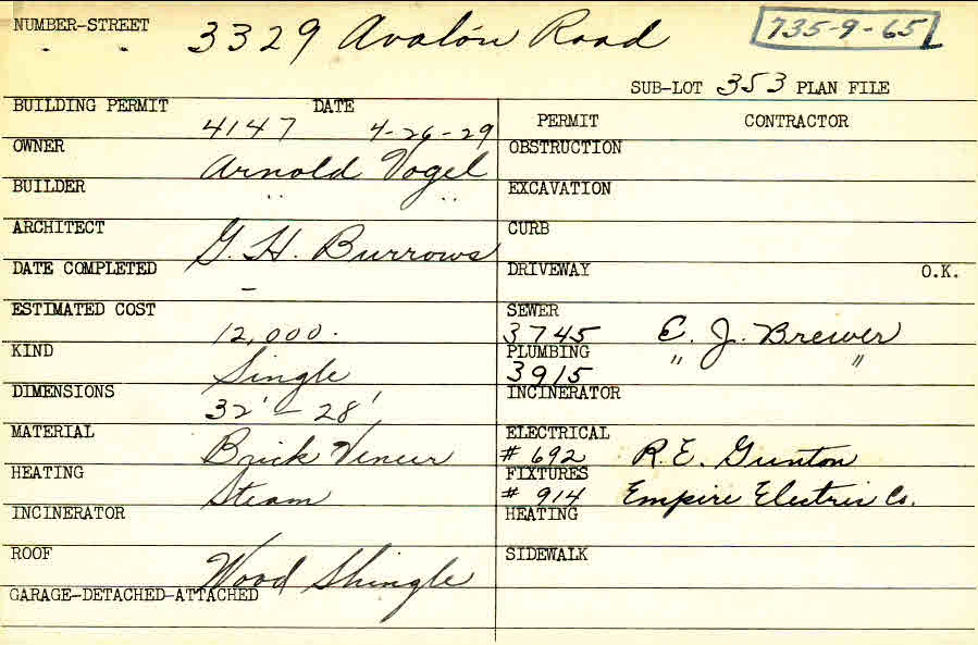 3329 Avalon Road Shaker Heights, OH 44120 PARCEL ID: 735-09-065 Building Permit Date: 04-26-1929 Plan File Number: 830 scanned, 2849 scanned, 4823 Microfilm Roll: Roll011,Roll041, Roll#66 Neighborhood: Fernway Owner: Vogel, Arnold Builder: Vogel, Arnold Architect: Burrows, G. H. Estimated Cost: 12000 Kind: Single, Single Residence or Dwelling Material: Brick Veneer Heating: Steam Roof: Wood Shingle  |