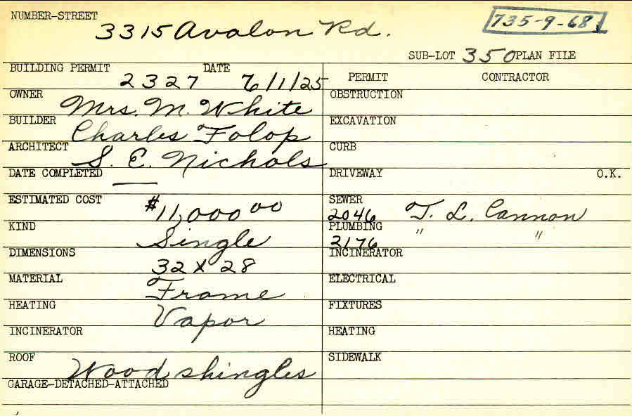 3315 Avalon Road Shaker Heights, OH 44120 PARCEL ID: 735-09-068 Building Permit Date: 06-01-1925 Plan File Number: 0 Neighborhood: Fernway Owner: White, Mrs. M. Builder: Folop, Charles Architect: Nichols, S. E. Estimated Cost: 11000 Kind: Single, Single Residence or Dwelling Material: Frame Heating: Vapor Roof: Wood Shingle Card Available: yes  |