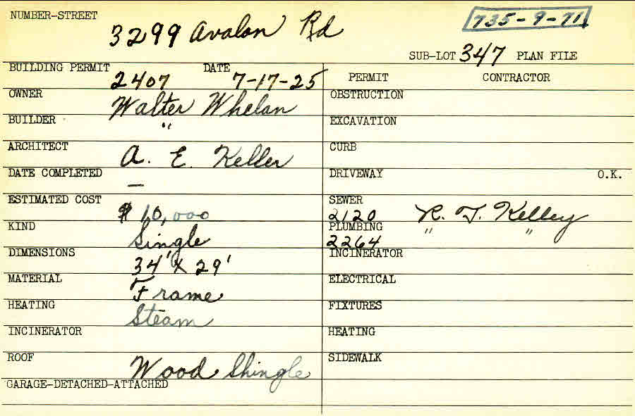 3299 Avalon Road Shaker Heights, OH 44120 PARCEL ID: 735-09-071 Building Permit Date: 07-17-1925 Plan File Number: 0 Neighborhood: Fernway Owner: Whelan, Walter Builder: Whelan, Walter Architect: Keller, Arthur Emil Estimated Cost: 10000 Kind: Single, Single Residence or Dwelling Material: Frame Heating: Steam Roof: Wood Shingle  |