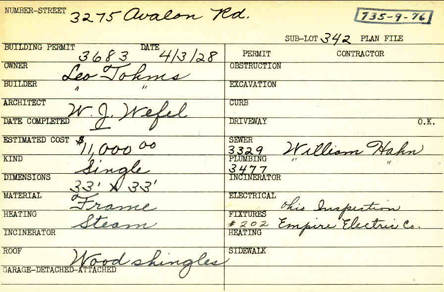 3275 Avalon Road Shaker Heights, OH 44120 PARCEL ID: 735-09-076 Building Permit Date: 04-03-1928 Plan File Number: 0 Neighborhood: Fernway Owner: Tohms, Leo Builder: Tohms, Leo Architect: Wefel, W. J. Estimated Cost: 11000 Kind: Single, Single Residence or Dwelling Material: Frame Heating: Steam Roof: Wood Shingle Card Available: yes  |