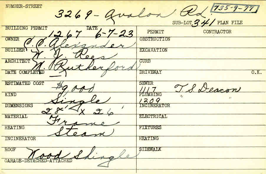 3269 Avalon Road Shaker Heights, OH 44120 PARCEL ID: 735-09-077 Building Permit Date: 06-07-1923 Plan File Number: 6977 Microfilm Roll: Roll#90 Neighborhood: Fernway Owner: Alexander, C. C. Builder: Rees, W. J. Architect: Rutherford, M. Estimated Cost: 9000 Kind: Single, Single Residence or Dwelling Material: Frame Heating: Steam Roof: Wood Shingle  |