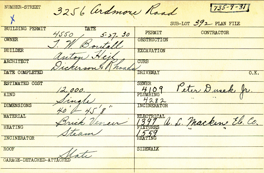 3256 Ardmore Road Shaker Heights, OH 44120 PARCEL ID: 735-09-081 Building Permit Date: 05-27-1930 Neighborhood: Fernway Owner: Boutall, T. W. Builder: Hejl, Anton Architect: Dickerson and Rhoads Estimated Cost: 12000 Kind: Single, Single Residence or Dwelling Material: Brick Veneer Heating: Steam Roof: Slate Blueprints: no blueprints on microfilm |