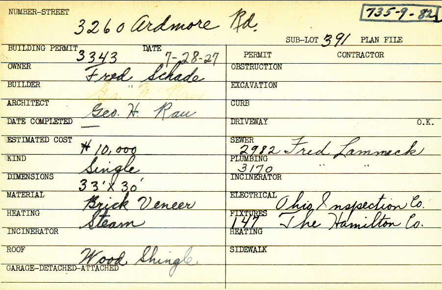 3260 Ardmore Road Shaker Heights, OH 44120 PARCEL ID: 735-09-082 Building Permit Date: 07-28-1927 Plan File Number: 0 Neighborhood: Fernway Owner: Schade, Fred Builder: Schade, Fred Architect: Rau, George H. Estimated Cost: 10000 Kind: Single, Single Residence or Dwelling Material: Brick Veneer Heating: Steam Roof: Wood Shingle |