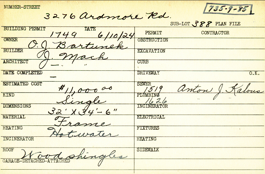3276 Ardmore Road Shaker Heights, OH 44120 PARCEL ID: 735-09-085 Building Permit Date: 06-10-1924 Plan File Number: 0 Neighborhood: Fernway Owner: Bartunek, O. J. Builder: Mack, John Estimated Cost: 11000 Kind: Single, Single Residence or Dwelling Material: Frame Heating: Hot Water Roof: Wood Shingle |