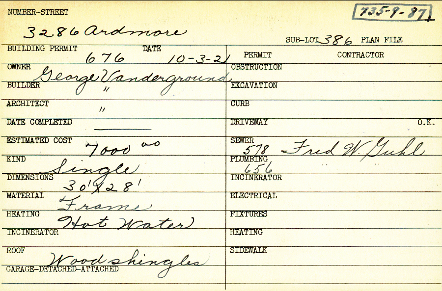 3286 Ardmore Road Shaker Heights, OH 44120 PARCEL ID: 735-09-087 Building Permit Date: 10-03-1921 Plan File Number: 7682 Microfilm Roll: Roll#94 Neighborhood: Fernway Owner: Vanderground, George Builder: Vanderground, George Architect: Vanderground, George Estimated Cost: 7000 Kind: Single, Single Residence or Dwelling Material: Frame Heating: Hot Water Roof: Wood Shingle |