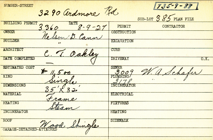 3290 Ardmore Road Shaker Heights, OH 44120 PARCEL ID: 735-09-088 Building Permit Date: 08-09-1927 Plan File Number: 0 Neighborhood: Fernway Owner: Cann, Nelson D. Builder: Cann, Nelson D. Architect: Oakley, C. T. Estimated Cost: 11500 Kind: Single, Single Residence or Dwelling Material: Frame Heating: Steam Roof: Wood Shingle |