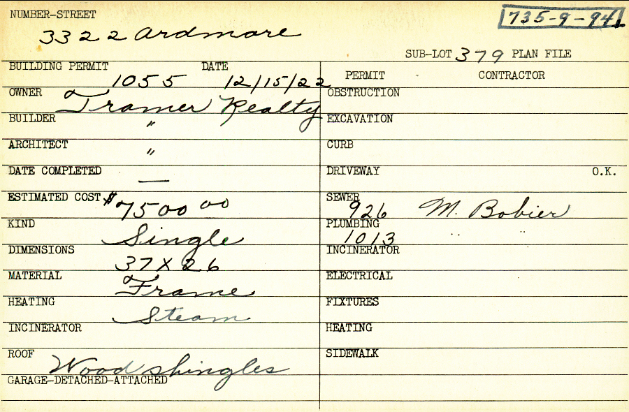 3322 Ardmore Road Shaker Heights, OH 44120 PARCEL ID: 735-09-094 Building Permit Date: 12-15-1922 Plan File Number: 4417 Microfilm Roll: Roll#63 Neighborhood: Fernway Owner: Tramer Realty Company Builder: Tramer Realty Company Architect: Tramer Realty Company Estimated Cost: 7500 Kind: Single, Single Residence or Dwelling Material: Frame Heating: Steam Roof: Wood Shingle |
