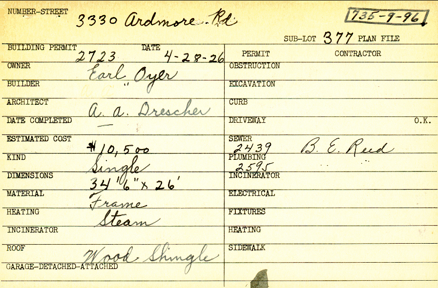 3330 Ardmore Road Shaker Heights, OH 44120 PARCEL ID: 735-09-096 Building Permit Date: 04-28-1926 Plan File Number: 10219 Microfilm Roll: NewRoll#3 Neighborhood: Fernway Owner: Oyer, Earl F. Builder: Oyer, Earl F. Architect: Drescher, A. A. Estimated Cost: 10500 Kind: Single, Single Residence or Dwelling Material: Frame Heating: Steam Roof: Wood Shingle |