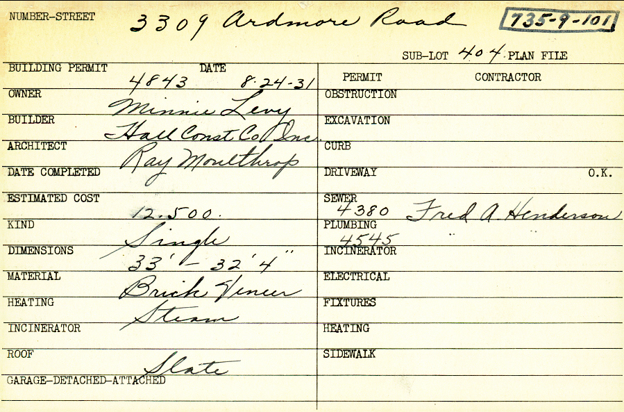3309 Ardmore Road Shaker Heights, OH 44120 PARCEL ID: 735-09-101 Building Permit Date: 08-24-1931 Plan File Number: 0 Neighborhood: Fernway Owner: Levy, Minnie Builder: Hall Construction Company Inc. Architect: Moulthrop, Ray Estimated Cost: 12500 Kind: Single, Single Residence or Dwelling Material: Brick Veneer Heating: Steam Roof: Slate |