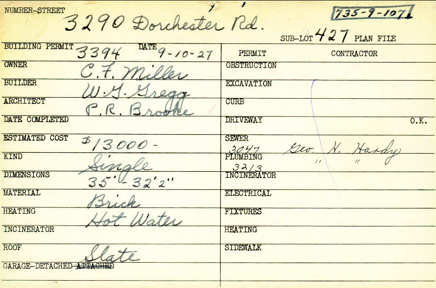 3290 Dorchester Road Shaker Heights, OH 44120 PARCEL ID: 735-09-107 Building Permit Date: 09-10-1927 Plan File Number: 0 Neighborhood: Fernway Owner: Miller, C. F. Builder: Gregg, W. G. Architect: Brooke, Philo R. Estimated Cost: 13000 Kind: Single, Single Residence or Dwelling Material: Brick Heating: Hot Water Roof: Slate Garage: detached |