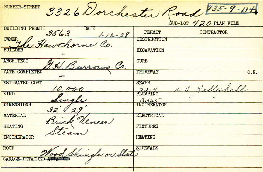 3326 Dorchester Road Shaker Heights, OH 44120 PARCEL ID: 735-09-114 Building Permit Date: 01-12-1928 Plan File Number: 0 Neighborhood: Fernway Owner: The Hawthorne Company Builder: The Hawthorne Company Architect: G.H. Burrows Company Estimated Cost: 10000 Kind: Single, Single Residence or Dwelling Material: Brick Veneer Heating: Steam Roof: Wood Shingle Garage: detached Card Available: yes |
