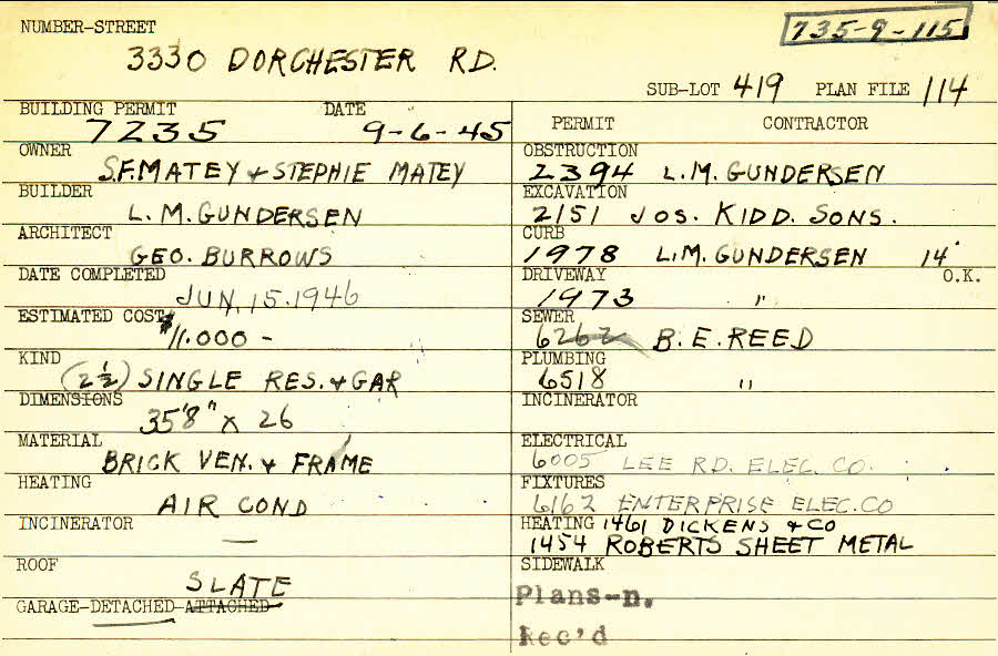 3330 Dorchester Road Shaker Heights, OH 44120 PARCEL ID: 735-09-115 Building Permit Date: 09-06-1945 Plan File Number: 114 all scanned Microfilm Roll: Roll001 Neighborhood: Fernway Owner: Matey, S.F. and Stephie Builder: Gundersen, L. M. Architect: Burrows, George Estimated Cost: 11000 Date Completed: 06-15-1946 Kind: Single 2-1/2 Material: Brick Veneer and Frame Heating: Air Conditioned Roof: Slate Garage: detached |