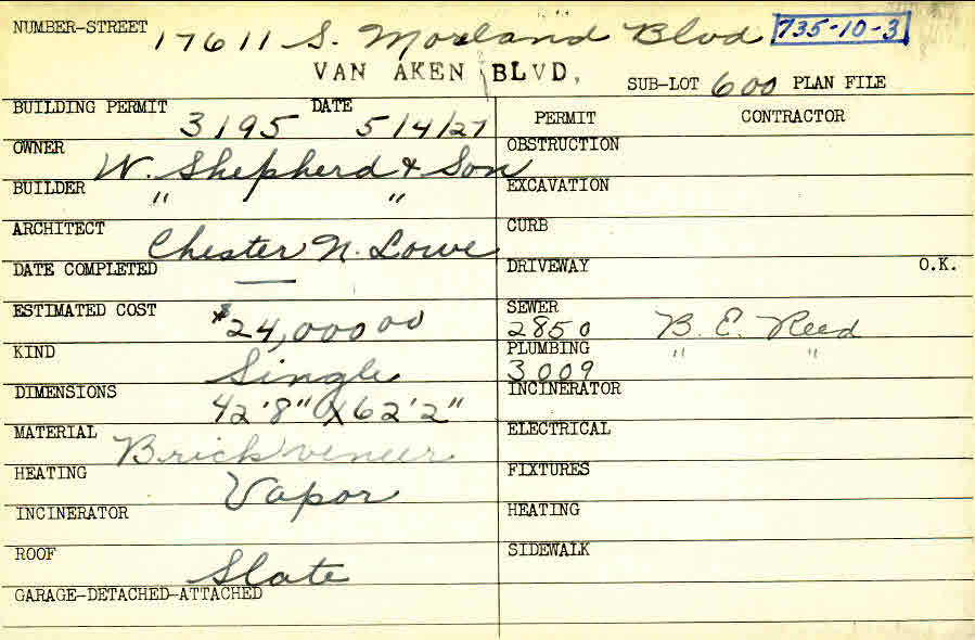 17611 Van Aken Boulevard Shaker Heights, OH 44120 PARCEL ID: 735-10-003 Building Permit Date: 05-04-1927 Plan File Number: 0 Neighborhood: Lomond Owner: W. Shepherd and Son Builder: W. Shepherd and Son Architect: Lowe, Chester N. Estimated Cost: 24000 Kind: Single, Single Residence or Dwelling Material: Brick Veneer Heating: Vapor Roof: Slate |