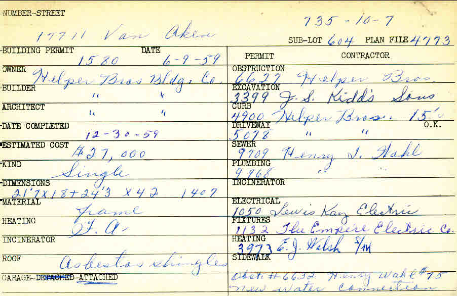 17711 Van Aken Boulevard Shaker Heights, OH 44120 PARCEL ID: 735-10-007 Building Permit Date: 06-09-1959 Plan File Number: 4773 Microfilm Roll: Roll#66 Neighborhood: Lomond Owner: Helper Brothers Building Company Builder: Helper Brothers Building Company Architect: Helper Brothers Building Company Estimated Cost: 27000 Date Completed: 12-30-1959 Kind: Single, Single Residence or Dwelling Material: Frame Heating: Forced Air Roof: Asbestos Shingles Garage: attached |
