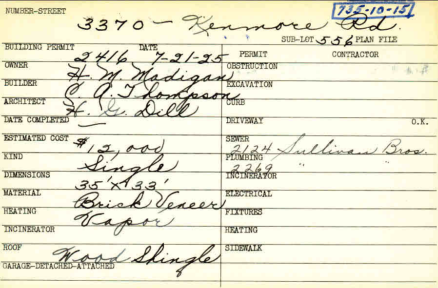 3370 Kenmore Road Shaker Heights, OH 44122 PARCEL ID: 735-10-015 Building Permit Date: 07-21-1925 Plan File Number: 0 Neighborhood: Fernway Owner: Madigan, H. M. Builder: Thompson, C. A. Architect: Dill, H. G. Estimated Cost: 12000 Kind: Single, Single Residence or Dwelling Material: Brick Veneer Heating: Vapor Roof: Wood Shingle Card Available: yes |