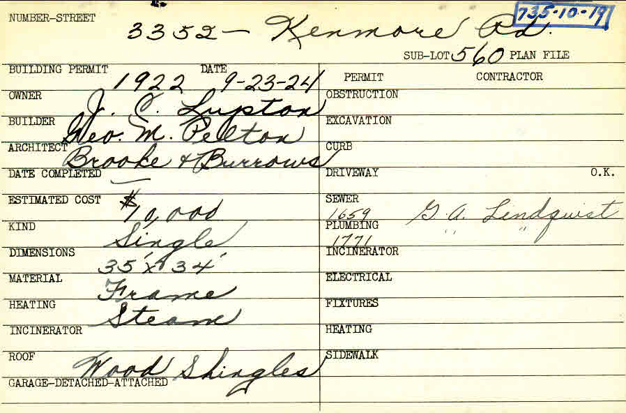3352 Kenmore Road Shaker Heights, OH 44122 PARCEL ID: 735-10-019 Building Permit Date: 09-23-1924 Plan File Number: 0 Neighborhood: Fernway Owner: Lupton, J. C. Builder: Pelton, George M. Architect: Brooke and Burrows Estimated Cost: 10000 Kind: Single, Single Residence or Dwelling Material: Frame Heating: Steam Roof: Wood Shingle Card Available: yes |