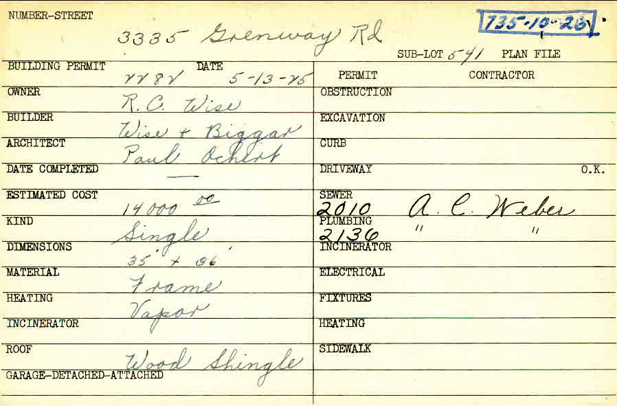 3335 Grenway Road Shaker Heights, OH 44122 PARCEL ID: 735-10-023 Building Permit Date: 05-13-1925 Plan File Number: 0 Neighborhood: Fernway Owner: Wise, R. C. Builder: Wise and Biggar Architect: Ochert, Paul Estimated Cost: 14000 Kind: Single, Single Residence or Dwelling Material: Frame Heating: Vapor Roof: Wood Shingle Card Available: yes |