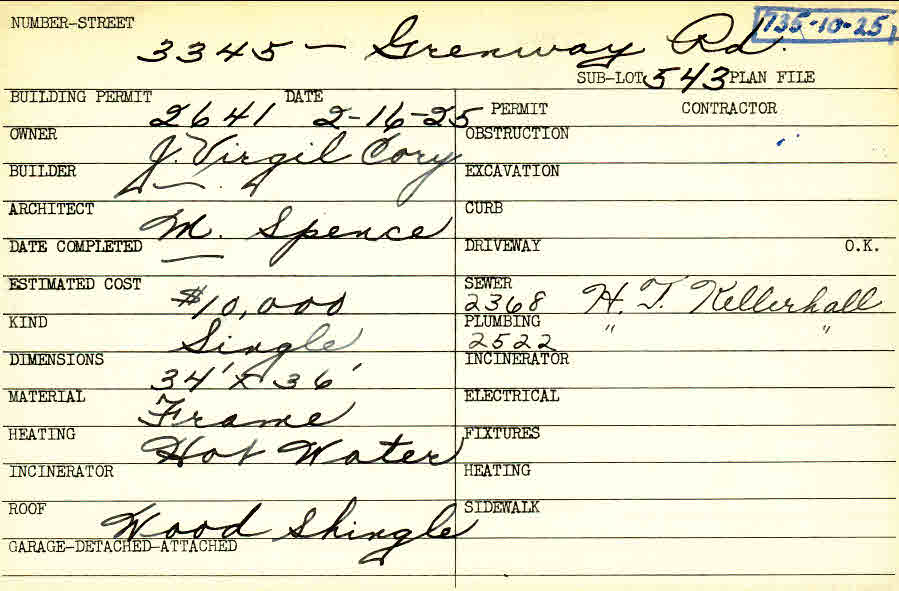 3345 Grenway Road Shaker Heights, OH 44122 PARCEL ID: 735-10-025 Building Permit Date: 02-16-1925 Plan File Number: 4204 all scanned Microfilm Roll: Roll061 Neighborhood: Fernway Owner: Cory, J. Virgil Architect: Spence, M. Estimated Cost: 10000 Kind: Single, Single Residence or Dwelling Material: Frame Heating: Hot Water Roof: Wood Shingle Blueprints: online, see link above |