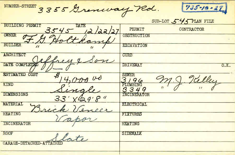 3355 Grenway Road Shaker Heights, OH 44122 PARCEL ID: 735-10-027 Building Permit Date: 12-22-1927 Plan File Number: 0 Neighborhood: Fernway Owner: Holtkamp, F. G. Builder: Holtkamp, F. G. Architect: Jeffrey and Son Estimated Cost: 14000 Kind: Single, Single Residence or Dwelling Material: Brick Veneer Heating: Vapor Roof: Slate Card Available: yes |