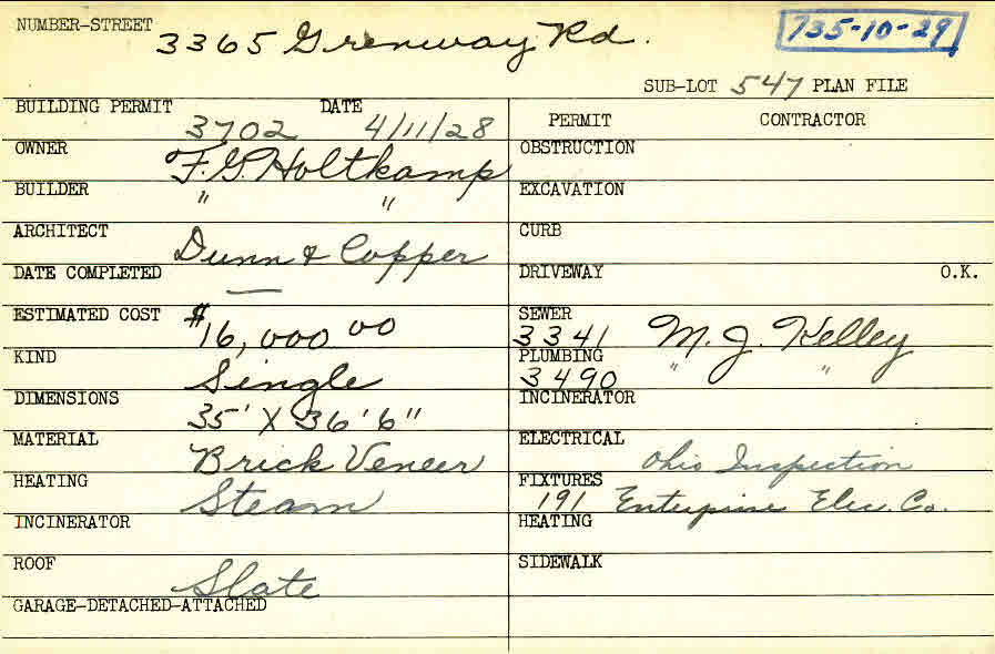 3365 Grenway Road Shaker Heights, OH 44122 PARCEL ID: 735-10-029 Building Permit Date: 04-11-1928 Plan File Number: 0 Neighborhood: Fernway Owner: Holtkamp, F. G. Builder: Holtkamp, F. G. Architect: Dunn and Copper Estimated Cost: 16000 Kind: Single, Single Residence or Dwelling Material: Brick Veneer Heating: Steam Roof: Slate Card Available: yes |