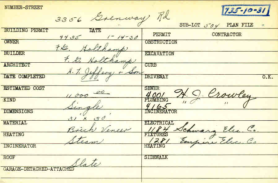 3356 Grenway Road Shaker Heights, OH 44122 PARCEL ID: 735-10-031 Building Permit Date: 01-14-1930 Plan File Number: 0 Neighborhood: Fernway Owner: Holtkamp, F. G. Builder: Holtkamp, F. G. Architect: H. T. Jeffrey and Son Estimated Cost: 11000 Kind: Single, Single Residence or Dwelling Material: Brick Veneer Heating: Steam Roof: Slate Card Available: yes |
