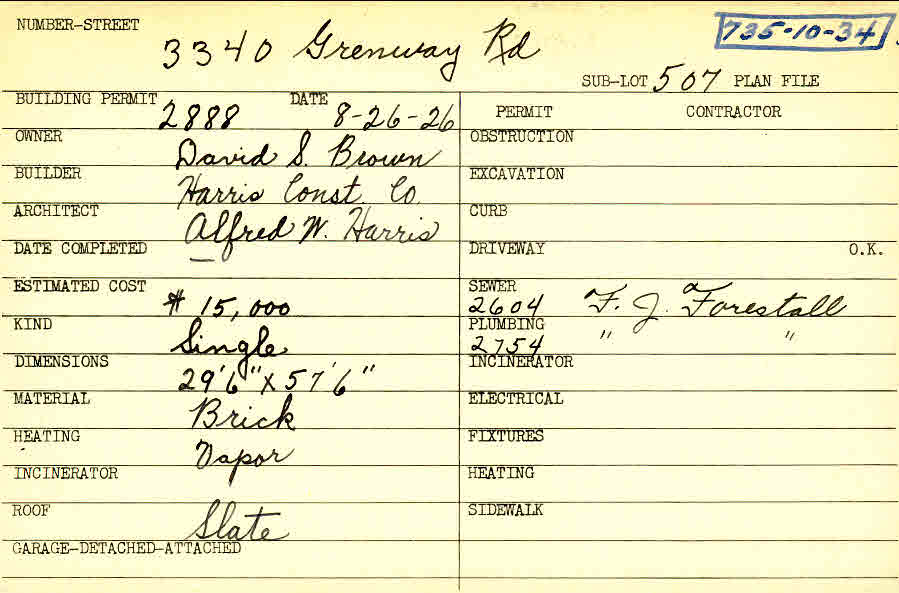 3340 Grenway Road Shaker Heights, OH 44122 PARCEL ID: 735-10-034 Building Permit Date: 08-26-1926 Plan File Number: 0 Neighborhood: Fernway Owner: Brown, David S. Builder: Harris Construction Company Architect: Harris, Alfred W. Estimated Cost: 15000 Kind: Single, Single Residence or Dwelling Material: Brick Heating: Vapor Roof: Slate Card Available: yes |