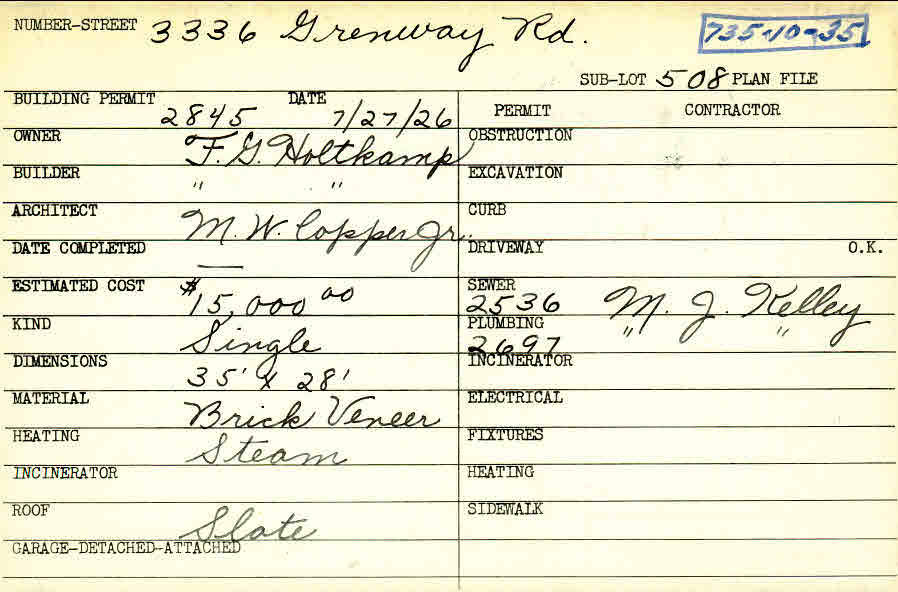 3336 Grenway Road Shaker Heights, OH 44122 PARCEL ID: 735-10-035 Building Permit Date: 07-27-1926 Plan File Number: 9786, 12635 Microfilm Roll: Roll#104, NewRoll#14 Neighborhood: Fernway Owner: Holtkamp, F. G. Builder: Holtkamp, F. G. Architect: Copper, Munroe Walker Jr. Estimated Cost: 15000 Kind: Single, Single Residence or Dwelling Material: Brick Veneer Heating: Steam Roof: Slate |