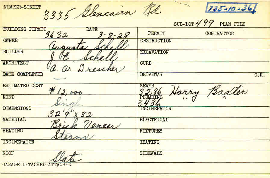 3335 Glencairn Road Shaker Heights, OH 44122 PARCEL ID: 735-10-036 Building Permit Date: 03-08-1928 Plan File Number: 5470 Microfilm Roll: Roll#74 Neighborhood: Fernway Owner: Schell, Augusta Builder: Schell, J. E. Architect: Drescher, A. A. Estimated Cost: 12000 Kind: Single, Single Residence or Dwelling Material: Brick Veneer Heating: Steam Roof: Slate |
