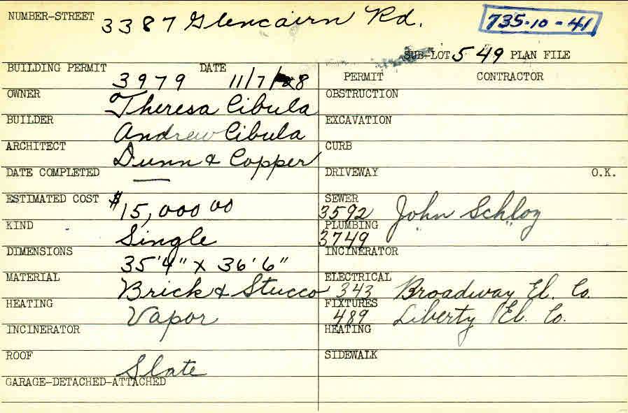 3387 Glencairn Road Shaker Heights, OH 44122 PARCEL ID: 735-10-041 Building Permit Date: 11-07-1928 Plan File Number: 4548 Microfilm Roll: Roll#63 Neighborhood: Fernway Owner: Cibula, Theresa Builder: Cibula, Andrew Architect: Dunn and Copper Estimated Cost: 15000 Kind: Single, Single Residence or Dwelling Material: Brick and Stucco Heating: Vapor Roof: Slate |