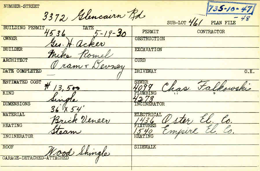 3372 Glencairn Road Shaker Heights, OH 44122 PARCEL ID: 735-10-047 Building Permit Date: 05-19-1930 Plan File Number: 0 Neighborhood: Fernway Owner: Acker, George H. Builder: Romel, Mike Architect: Oram and Devney Estimated Cost: 13500 Kind: Single, Single Residence or Dwelling Material: Brick Veneer Heating: Steam Roof: Wood Shingle Card Available: yes |