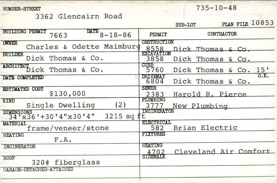 3362 Glencairn Road Shaker Heights, OH 44122 PARCEL ID: 735-10-048 Building Permit Date: 08-18-1986 Plan File Number: 202 scanned, 10853* Microfilm Roll: Roll014, NewRoll#6 Owner: Maimberg, Charles and Odette Builder: Dick Thomas and Company Architect: Dick Thomas and Company Estimated Cost: 130000 Kind: Single, Single Residence or Dwelling (2) Material: Frame / Veneer / Stone Heating: Forced Air Roof: Fiberglas |
