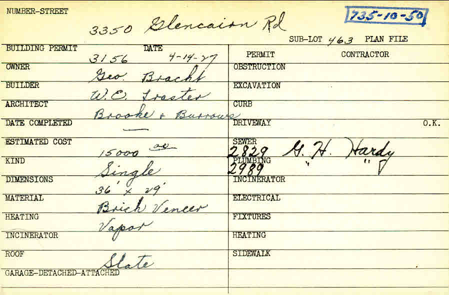3350 Glencairn Road Shaker Heights, OH 44122 PARCEL ID: 735-10-050 Building Permit Date: 04-14-1927 Plan File Number: 5140 Microfilm Roll: Roll#70 Neighborhood: Fernway Owner: Bracht, George Builder: Traster, W. E. Architect: Brooke and Burrows Estimated Cost: 15000 Kind: Single, Single Residence or Dwelling Material: Brick Veneer Heating: Vapor Roof: Slate |
