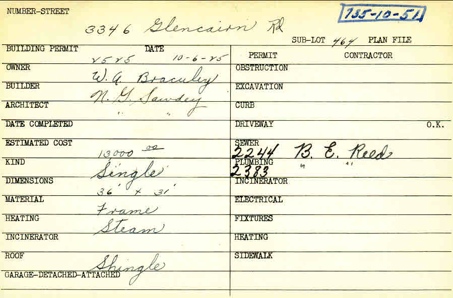 3346 Glencairn Road Shaker Heights, OH 44122 PARCEL ID: 735-10-051 Building Permit Date: 10-06-1925 Plan File Number: 0 Neighborhood: Fernway Owner: Braculey, W. A. Builder: Sawdey, N. G. Architect: Sawdey, N. G. Estimated Cost: 13000 Kind: Single, Single Residence or Dwelling Material: Frame Heating: Steam Roof: Shingles Card Available: yes |