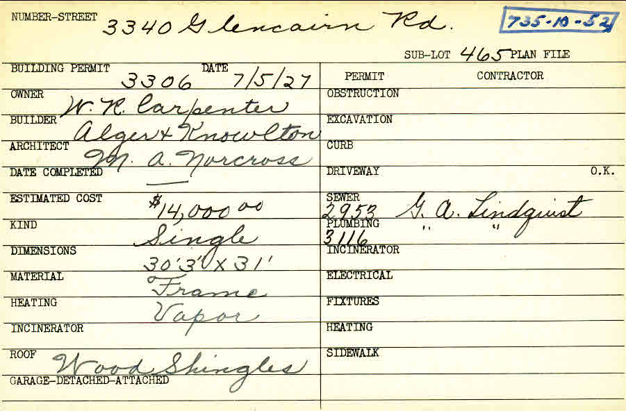 3340 Glencairn Road Shaker Heights, OH 44122 PARCEL ID: 735-10-052 Building Permit Date: 07-05-1927 Plan File Number: 6813 Microfilm Roll: Roll#88 Neighborhood: Fernway Owner: Carpenter, W. R. Builder: Alger and Knowlton Architect: Norcross, M. A. Estimated Cost: 14000 Kind: Single, Single Residence or Dwelling Material: Frame Heating: Vapor Roof: Wood Shingle |