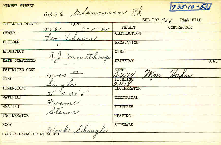 3336 Glencairn Road Shaker Heights, OH 44122 PARCEL ID: 735-10-053 Building Permit Date: 11-02-1925 Plan File Number: 2053 Microfilm Roll: Roll#31 Neighborhood: Fernway Owner: Thoms, Leo Builder: Thoms, Leo Architect: Moulthrop, R. J. Estimated Cost: 12000 Kind: Single, Single Residence or Dwelling Material: Frame Heating: Steam Roof: Wood Shingle |