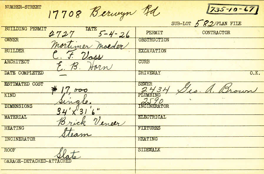 17708 Berwyn Road Shaker Heights, OH 44120 PARCEL ID: 735-10-067 Building Permit Date: 05-04-1926 Plan File Number: 0 Neighborhood: Fernway Owner: Moeder, Mortimer Builder: Voss, C. F. Architect: Horn, E. B. Estimated Cost: 17000 Kind: Single, Single Residence or Dwelling Material: Brick Veneer Heating: Steam Roof: Slate |