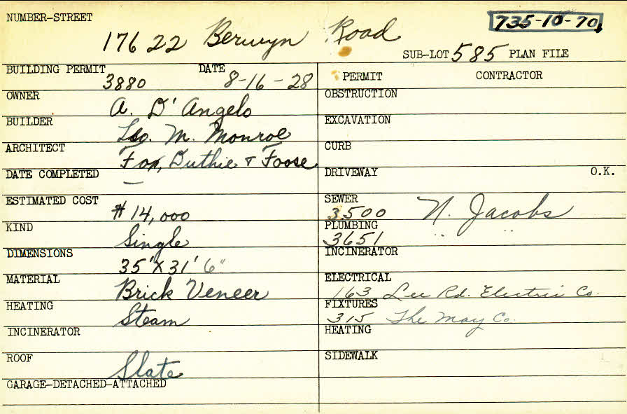 17622 Berwyn Road Shaker Heights, OH 44120 PARCEL ID: 735-10-070 Building Permit Date: 08-16-1928 Plan File Number: 0 Neighborhood: Fernway Owner: D'Angelo, A. Builder: Monroe, Leo M. Architect: Fox, Duthie and Foose Estimated Cost: 14000 Kind: Single, Single Residence or Dwelling Material: Brick Veneer Heating: Steam Roof: Slate |